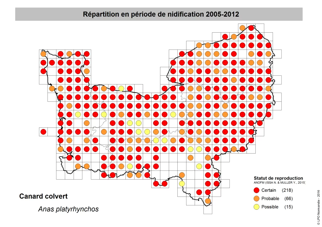 On constate que dans la zone échantillonnée, le Canard colvert est une espèce que l’on rencontre fréquemment. Il est très présent sur le littoral du Cotentin, en contraste très marqué avec l’intérieur de la presqu’île. Il est aussi très fréquent dans l’estuaire de la Seine, en vallée de la Seine amont, ainsi qu’en Pays-de-Bray et dans le Vexin normand. Il est fréquent dans le Pays-de-Caux et les plateaux de Rouen ainsi que dans le Pays d’Ouche.